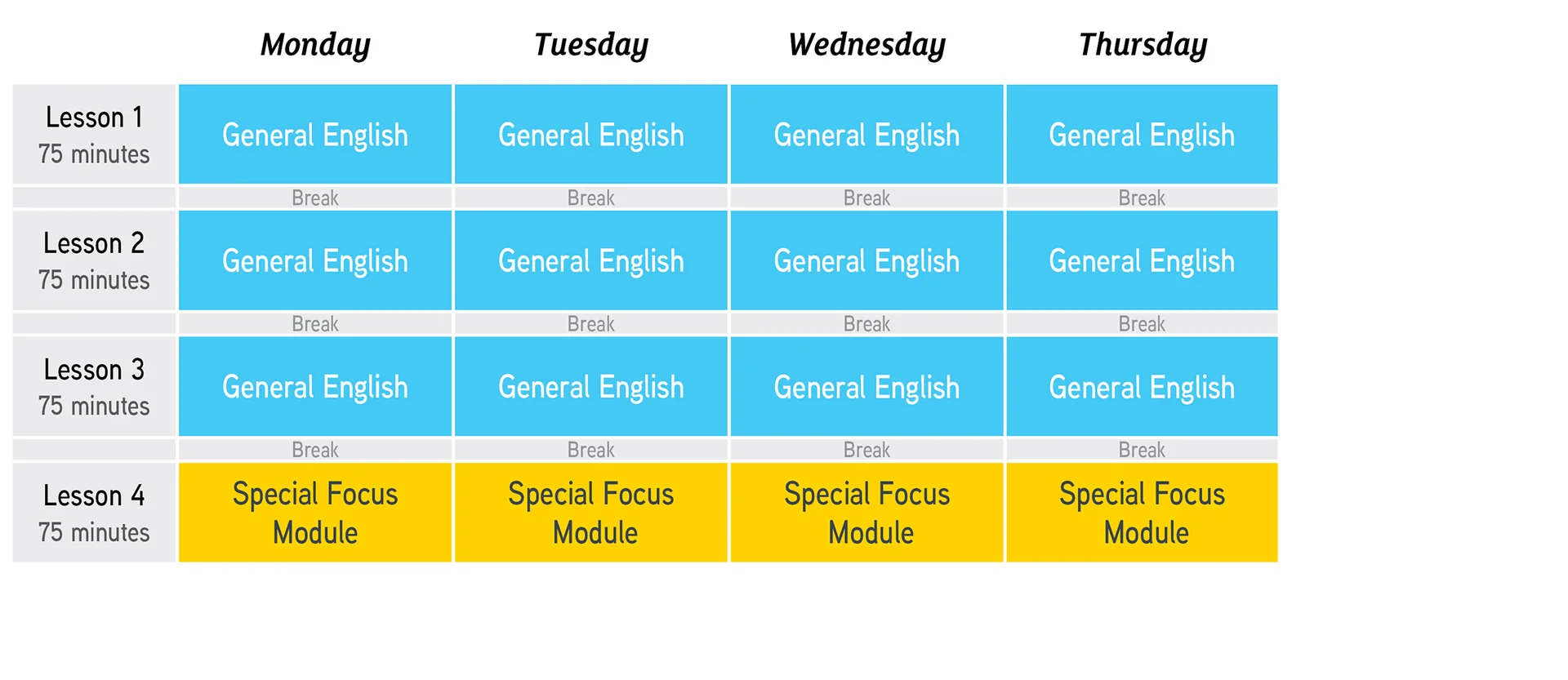 Coming on a student visa? Make sure to attend the 20hrs classes presented in blue and yellow, Monday to Thursday.