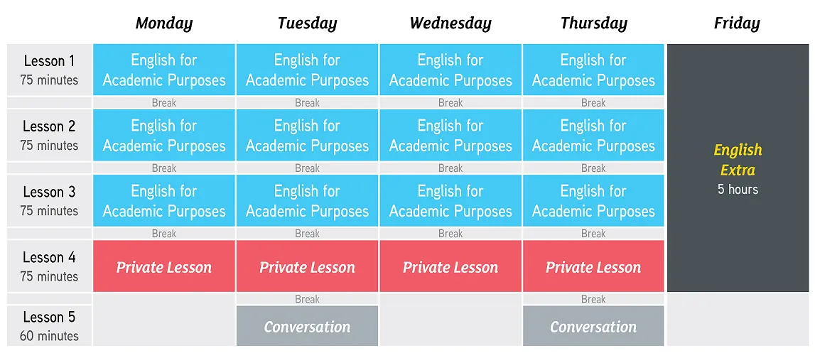 The difference with our Intensive Academic English course? 5 hours per week of private lessons!